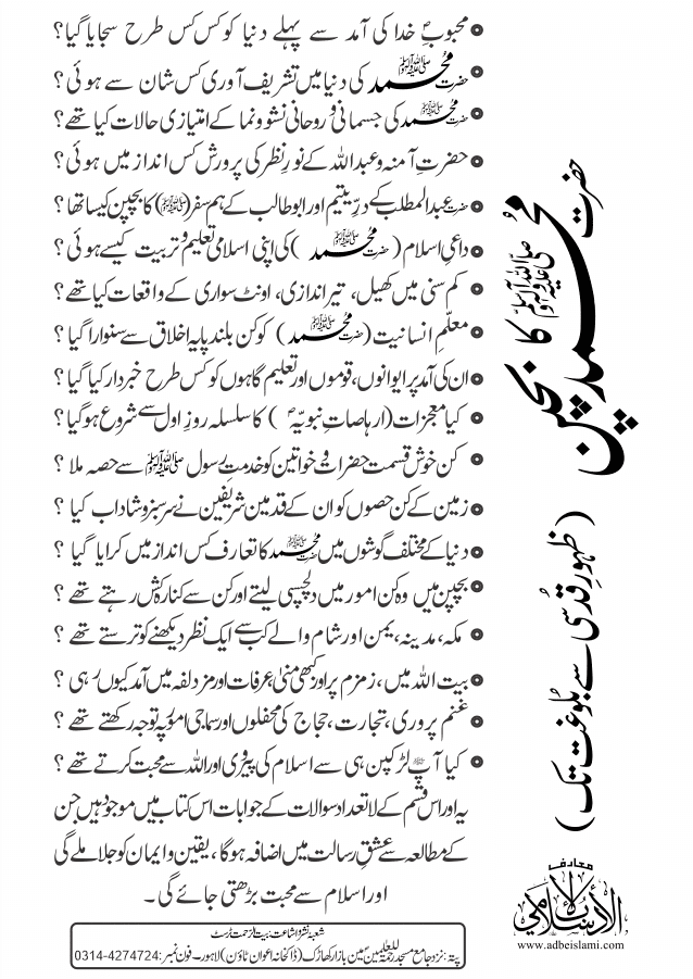 1 بچپن سے بلوغت: اس کاقرآنی نام اَلنَّجْمُ الثَّاقِبُ ’’روشن ستارہ‘‘(حضرت محمد ﷺ کا بچپن) ہے، جو آپکے ہاتھوں میں ہے۔