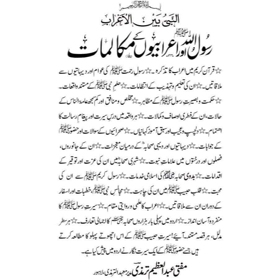 یہ کتاب رسولِ اکرم ﷺ اور عامۃ الناس کے درمیان ہونے والے دلچسپ اور سبق آموز مکالمات پر مشتمل ہے۔ اس میں قرآن کریم میں عوام الناس کا تذکرہ، دیہاتیوں سے ملاقاتیں، ان کی تعلیم و تہذیب کے انتظامات، حلم و حکمتِ نبوی ﷺ اور سیرتِ طیبہ کے دروس کو نہایت خوبصورتی سے بیان کیا گیا ہے۔ یہ کتاب ہر قاری کے لیے سیرتِ نبوی ﷺ کا عملی پیغام پیش کرتی ہے۔