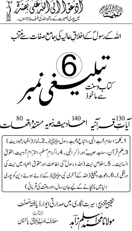 “دینی جدوجہد میں رسول اللہ ﷺ کا طریقہ زندہ کرنے اور زندگی کے تمام شعبوں کو اللہ جل شانہٗ کے اوامر اور نبی کریم ﷺ کے طریقہ پر لانے اور کام کرنے والوں میں یہ بات پیدا کرنے کے لیے چھے نمبر مقرر کیے گئے”